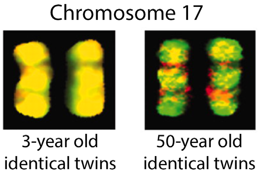 La genética explica que los gemelos tengan el mismo DNA al nacer y la epigenética que este cambie a lo largo de la vida debido a las influencias del ambiente. A la izquierda comparación del cromosoma 17 de unos gemelos de 3 años (el amarillo presenta igualdad de información genética) y a la derecha misma comparación en gemelos de 50 años (el verde y el rojo representa diferencias entre cromosomas fruto de activación o no de genes según ambiente) (estudio).