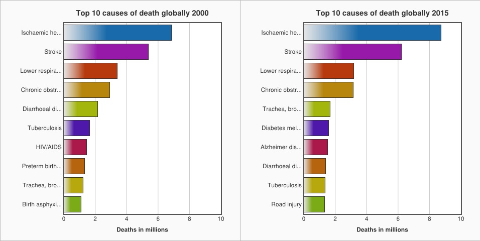 En solo 15 años la situación ha cambiado significativamente. Del año 2000 al 2015 ha habido importantes movimientos en el top 10, destacando el aumento del número de enfermedades crónicas, la incorporación de alzheimer y diabetes dentro de dicho grupo o la salida de SIDA y muertes infantiles (enlace).