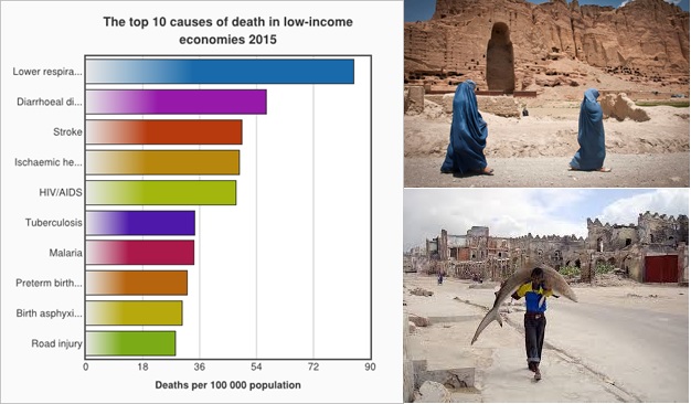 1º Grupo, países de muy bajos ingresos: Aquí la principal causa de muerte son las enfermedades contagiosas por microorganismos, los partos y la malnutrición proteica. Se trata de paises donde escasea la comida, la salubridad de las agua o la higiene. La esperanza de vida se situa en algunos casos por debajo de los 50 años (referencia).