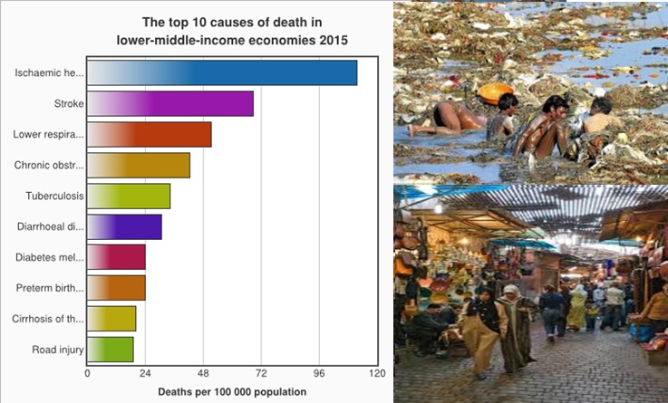 2º Grupo, países de bajos ingresos: Destacan las enfermedades cardiovasculares y cerebrovasculares, seguidas de enfermedades infecciosas por microorganismos. Ya no hablamos tanto de problemas de cantidad alimentaria como de calidad de esta, lo cual hace que entren en el ranking enfermedades metabólicas como la diabetes u otras relacionadas con el abuso de sustancias como la cirrosis y la Enfermedad Pulmonar Obstructiva Crónica (EPOC).