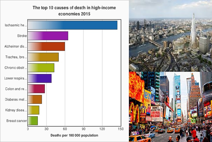 4º Grupo, países de ingresos altos: Las enfermedades vasculares y coronarias lideran el ranking con bastante diferencia respecto a las otras. Aparecen más tipos de cánceres y en cuarta posición el Alzheimer y otras demencias. La esperanza de vida llega a los 86 años en algunos casos como España, Andorra o Japón.