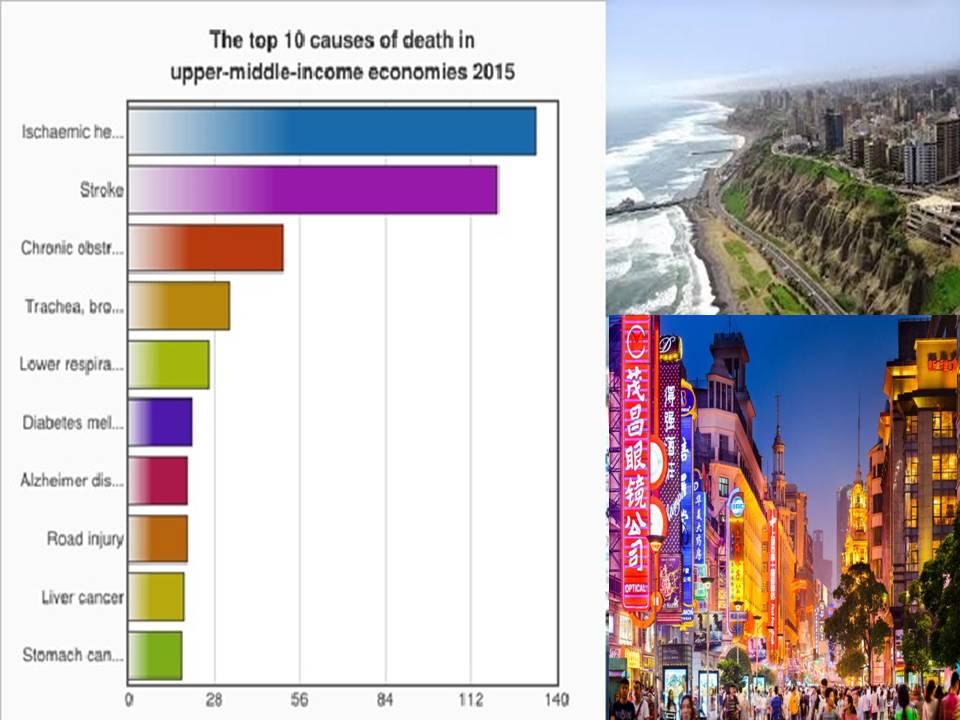 3º Grupo, países de ingresos medios: La incidencia de infartos de miocardio y cerebrales aumenta. Aparecen en el ranking los accidentes de tráfico y van saliendo del Top 10 las enfermedades infecciosas. La esperanza de vida roza los 80 años. Destacan en la lista 3 tipos diferentes de cáncer y la aparición del Alzheimer.